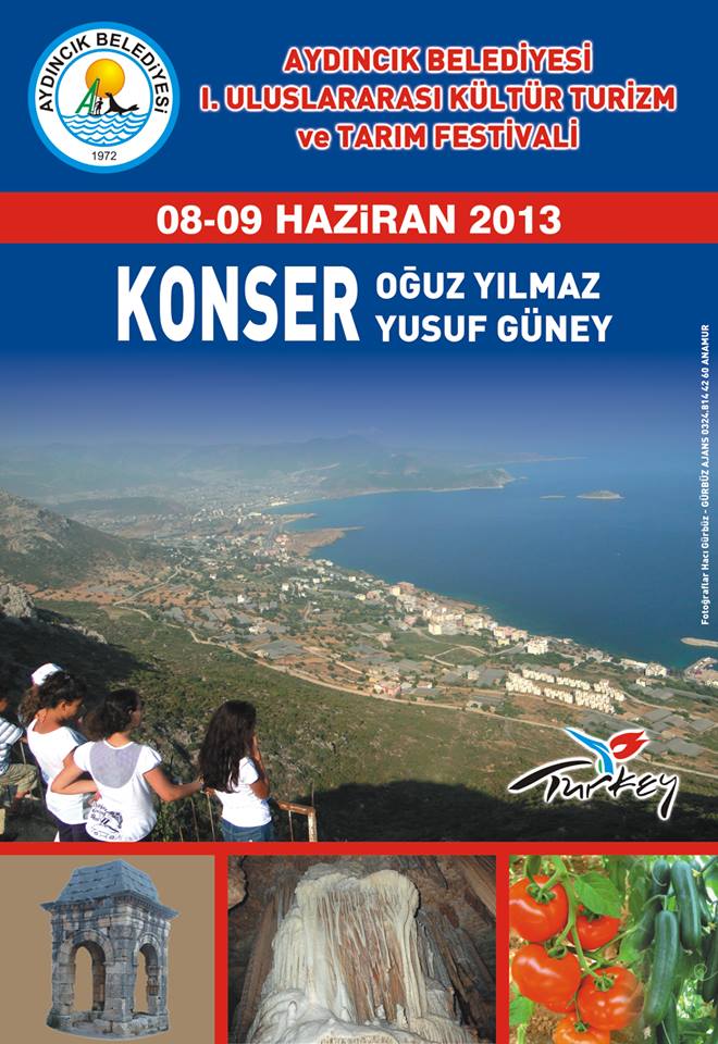 Aydıncık 8 ve 9 Haziranda muhteşem bir festivale imza atacak. Aydıncık Belediyesi 1.Uluslararası Kültür, Turizm ve Tarım Festivali düzenleyecek.8-9 Haziran 2013 tarihlerinde gerçekleşecek olan festivalde Yamaç paraşütü, stand gezileri, yüzme yarışları, halkoyunları gösterileri, stand up gösterileri, aynalıgöl mağarası gezisi, MBK sualtı balıkadamlar gösterisi, ilüzyon gösterileri, sanatçılar Deniz, Ayşe Bağı, Oğuz Yılmaz ve Yusuf Güney konserleri gerçekleşecek.Aydıncık Belediye Başkanı Ferhat Aktan hazırlattırdığı afiş, bilboard ve pankartlarla tüm yöre insanını 1.si düzenlenecek olan Uluslararası Kültür, Turizm ve Tarım Festivasli'ne davet etti.