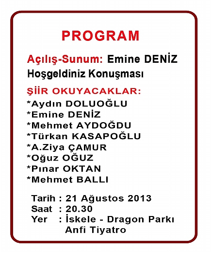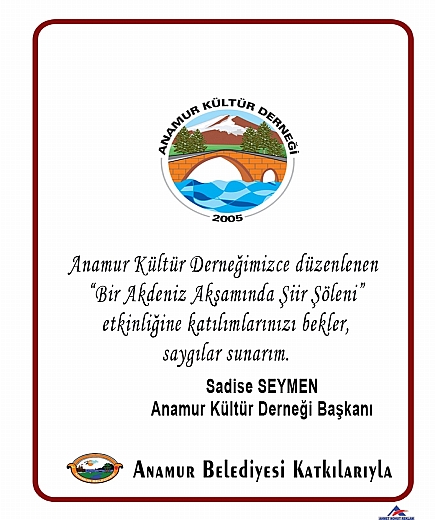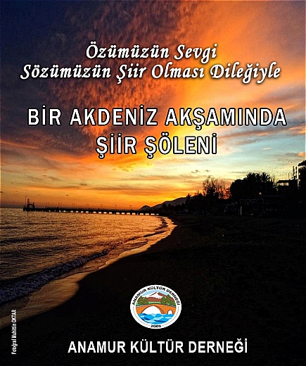 BİR AKDENİZ AKŞAMINDA ŞİİR ŞÖLENİ Anamur Kültür Derneğince düzenlenen “Bir Akdeniz Akşamında Şiir Şöleni” yapılıyor… Anamur Kültür Derneğince düzenlenmiş olan şiir gecesi İskel Dragon Parkı Anfi Tiyatroda yapılacak. Şiir gecesine Anamur Belediyesi de katkı sunuyor. Birçok başarılı etkinliğe imza atan Anamur Kültür Derneği şiir şöleni ile yine Anamurluların karşısına çıkıyor. Dernek İkinci Başkanı Yaşar ALICI: "Kültür etkinliklerine bir yenisini daha ekliyoruz. Bütün Anamur Halkını Anfi Tiyatroya bekliyoruz. Şiir ziyafeti yaşamaya davet ediyoruz" dedi.  21 Ağustos 2013 itibari ile Saat:20.30’da başlayacak olan programa Anamurlu tanıdık yüzler katılacak.  Programda Emekli Edebiyat Öğretmeni Aydın DOLUOĞLU, Öğretmen ve program sunucusu Emine DENİZ, Mehmet AYDOĞDU, Edebiyat Öğretmeni ve Anamur Belediye Meclisi Üyesi Türkan KASAPOĞLU, Emekli Öğretmen A. Ziya ÇAMUR, Emekli Orman Mühendisi-Şair Oğuz OĞUZ, Pınar OKTAN ve Bozyazı Belediye Başkanı Mehmet BALLI şiirler sunacaklar. Anamur Kültür Derneğince düzenlenen gecede Anamur'un yerel sanatçısı Kürşad ARIKAN ve arkadaşlarınca müzik programı da gerçekleştirilecek.  Anamur Kültür Derneği tüm şiir severleri bu güzel ve renkli etkinliğe davet etti.