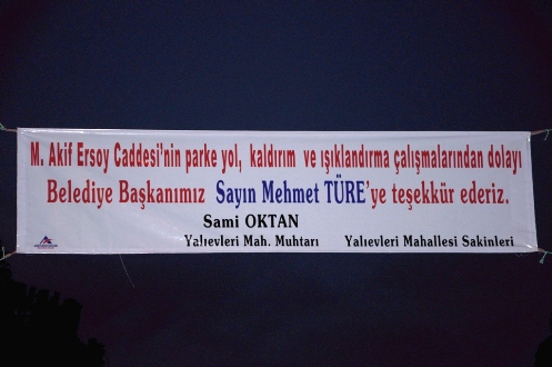 YALIEVLERİ MAHALLESİNDEN BAŞKAN TÜRE'YE TEŞEKKÜRAnamur Yalıevleri Mahallesi Mehmet Akif Ersoy Caddesi'ne bir pankart asarak Anamur Belediye Başkanı Mehmet TÜRE'ye teşekkür etti. Anamur Yalıevleri Mahallesi Muhtarı Sami Oktan Mahalle sakinlerinin isteği ile Mehmet Akif Ersoy Caddesi'ne bir pankart asarak Anamur Belediye Başkanı Mehmet TÜRE'ye teşekkür etti.Yaz döneminde parke yol olarak yapımına başlanan ve çok kısa bir sürede tamamlanarak hizmete açılan Mehmet Akif Ersoy Caddesi'nin çift tarafı da ışıklandırıldı. Kaldırım çalışması da tamamlanan Mehmet Akif Ersoy Caddesi'nde kış döneminde yaşanan tüm olumsuzluklar çözüldü. Geçtiğimiz hafta içerisinde Yalıevleri Mahallesi Muhtarı Sami Oktan da TRT sitesi civarında bir pankart astırarak mahalle halkı adına teşekkür etti. Pankartta; Parke Yol, kaldırım ve ışıklandırma çalışmasından dolayı Başkan Türe'ye teşekkür ederiz' ibaresi yer aldı.Anamur Belediye Başkanı Mehmet TÜRE Yalıevleri Mahalle Muhtarı Sami Oktan'a nezaket ziyaretinde bulunurken, yaşadığı kaza sonucu kolu kırılan İskele Mahallesi Muhtarı Fatih Uygur'u da ziyaret ederek geçmiş olsun dileklerinde bulundu.