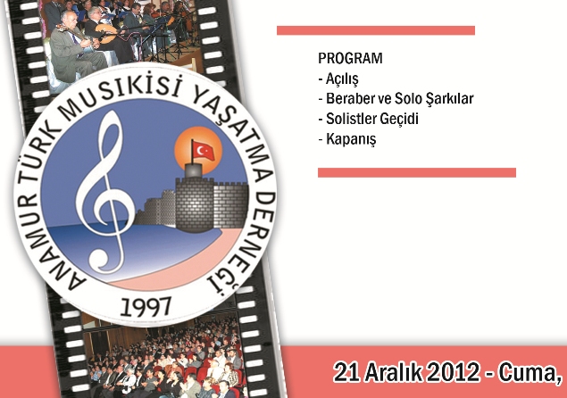 Anamur Türk Musıkisi Yaşatma Derneği Kış Konseri düzenliyor. Anamur Türk Musıkisi Yaşatma Derneği Kış Konseri düzenleyecek.Konser 21 Aralık akşamı Belediye Meclis Salonu'nda gerçekleşecek. Derneğin geleneksel hale getirdiği Kış Konserinde muhteşem bir Türk Sanat Müziği ziyafeti sunulacak. Açılış, beraber ve Solo şarkılar, solistler geçidi ve kapanış şeklinde gerçekleşecek olan konser saat 19:30'da başlayacak.