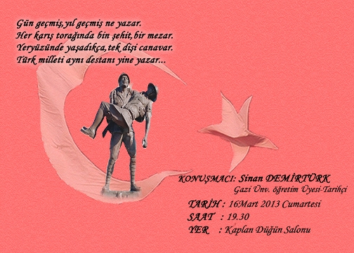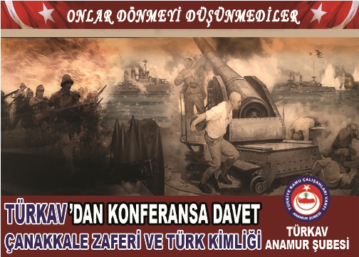 TÜRKAV (Türkiye Kamu Çalışanları Vakfı)Anamur Şube Başkanı Veli SAVCI yaptığı açıklamada; “Çanakkale’de ebediyete intikal eden ve yedi düvele karşı canlarını hiç çekinmeden vatan için feda eden, Çanakkale Geçilmez destanını yaratan Çanakkale Şehitlerimizi anma amacıyla bir konferans düzenledik. Konferansımıza bütün Anamurluları bekliyoruz.” dedi.TÜRKAV Anamur Şubesince düzenlenen konferans “Çanakkale Zaferi ve Türk Kimliği” adını taşıyor.![]() Konferansa konuşmacı olarak; Gazi Üniversitesi Öğretim Üyesi (Tarihçi) Sinan DEMİRTÜRK katıyor. Konferans; 16 Mart 2013-Cumartesi, Saat:19.30’da, Kaplan Düğün Salonunda yapılacak.Konferansa Anamur Halkının yoğun katılım yapması bekleniyor.