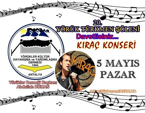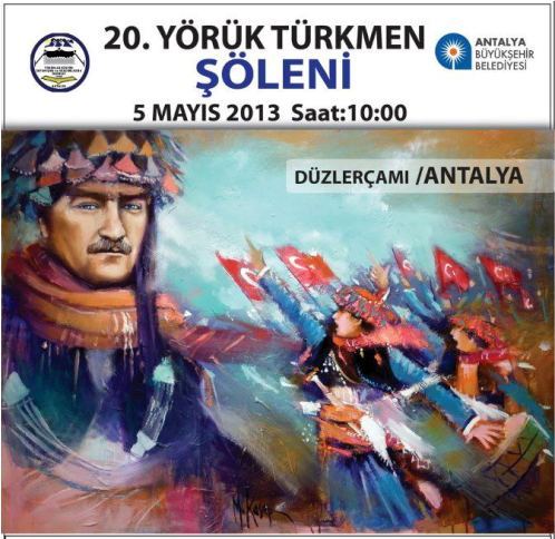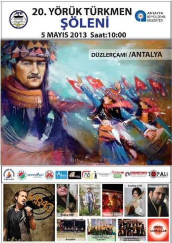 Antalya 20.Yörük Türkmen Şöleni Türkiye’nin en büyük Yörük buluşması için Antalya Yörükler Derneği hazırlıklarına devam ediyor. 2013 Nisanında Kepez'de tertiplenen "GÖÇ" programı ile Türkiye gündemine oturan Antalya Yörükler Derneği Başkanı Abdullah DUMAN, 5 Mayıs 2013 Antalya Yörük Şölen’i için hedefini büyütüp, Isparta ve Burdur'un da desteğini alarak, asgari 250,000 çıtası koydu. Geçmiş kültürlerini gelecek nesillere taşımak için bu etkinlikleri düzenlediklerini dile getiren Duman, Yörük Türkmen Şölenine herkesi davet etti. 5 Mayıs 2012 tarihlerinde Düzlerçamı mevkiinde gerçekleşecek olan Yörük Türkmen Şölenine bu yıl; Antalya’dan ve Türkiye’nin diğer illerinden Yörük ve Türkmen Dernek Başkanları, İl Beyleri, Mülki Erkan, Belediye Başkanları, Siyasi Parti İl ve İlçe Başkanları, Kamu Kurum ve Kuruluş temsilcileri, Meslek Odaları Başkanları, Yörük Şair, Yazar, Ressam ve Ses/Saz sanatçıları da katılacaklardır.  Etkinlikler kapsamında; 3 Mayıs 2013 17:00 Terra City Alışveriş Merkezinde Mustafa Ali Kasap'ın "Zeybek kadınlar" isimli resim sergisi,  4 Mayıs 2013 17:00 Yörük Kültür Merkezi'nde, yazarlar Osman ŞAHİN, Zeki Oğuz, Buket Şahin ve Çınar Arıkan ile Şairler Muhammet Güzel ve Abdullah Ayata'nın imza günü,  5 Mayıs 2013 10:00 Düzlerçamı Karaman Piknik Alanında, Ressam İlknur Bakış ve Ressam Nuray Mayda resim sergilemesi, Araştırmacı Gazeteci, Yazar Banu Avar da, kitaplarını imzalayarak şölende yerlerini alacaklardır. Şölende; Kıraç, Tuğba Ger, Musa Taş, Sevilay Gök, Mustafa Aksoy, Avşarlar konser verip, Antalya Yörükler Derneği Halk Oyunları Ekipleri, Aydın Taşkın ve Muğla Yörük Obaları Zeybekleri ve sürpriz sanatçı davetlilere unutulmayacak anlar yaşatacaklardır.  Haber: İlknur BAKIŞ anamursedir.com İzmir Temsilcisi